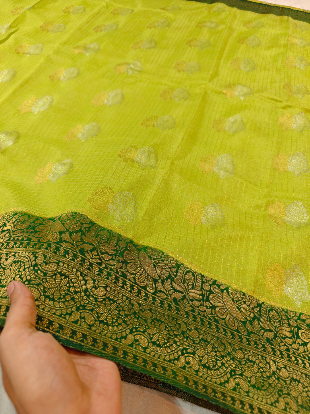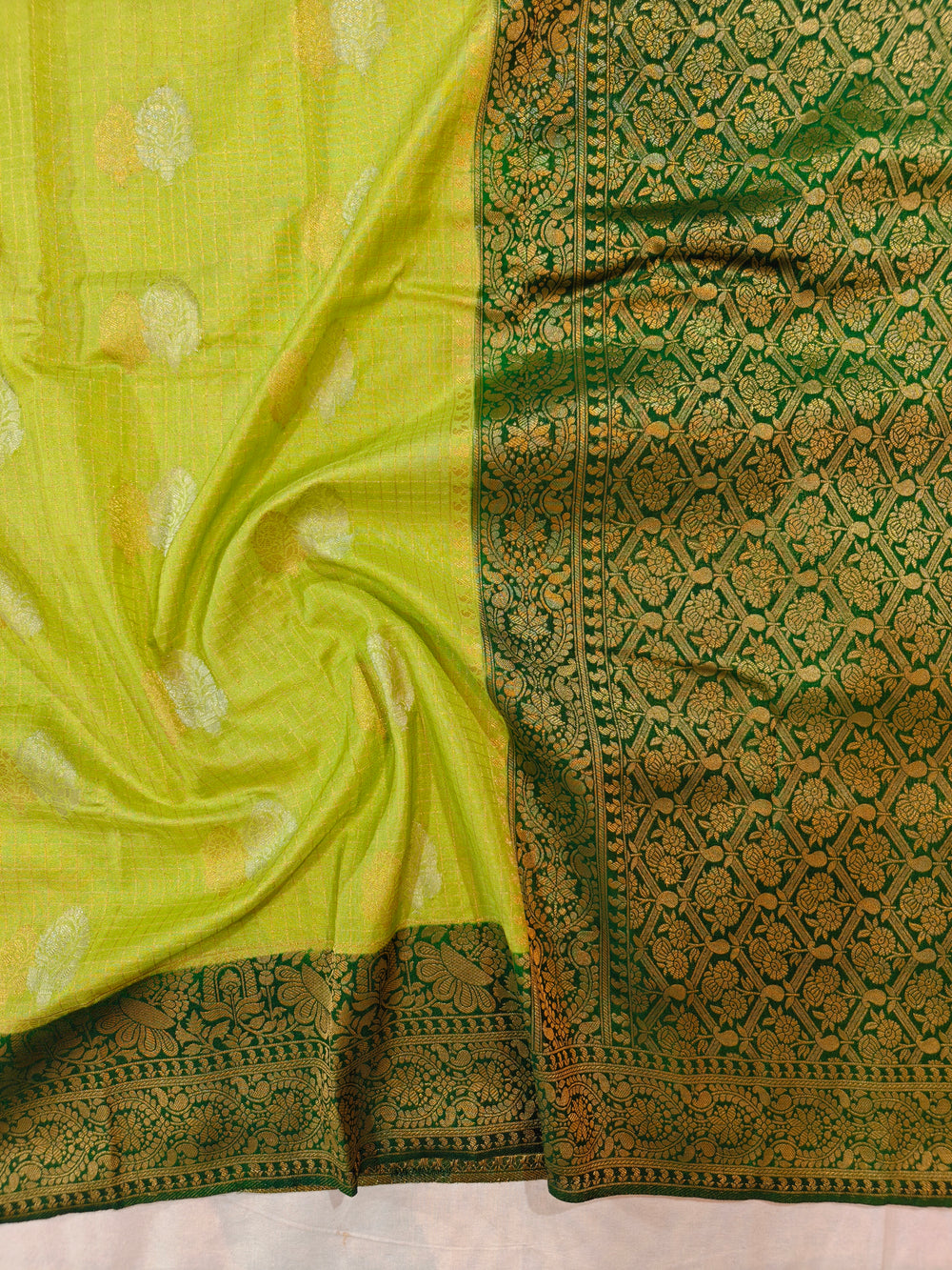 LIME YELLOW COLOUR CREPE GEORGETTE CHECKS WIT BOTTLE GREEN BORDER