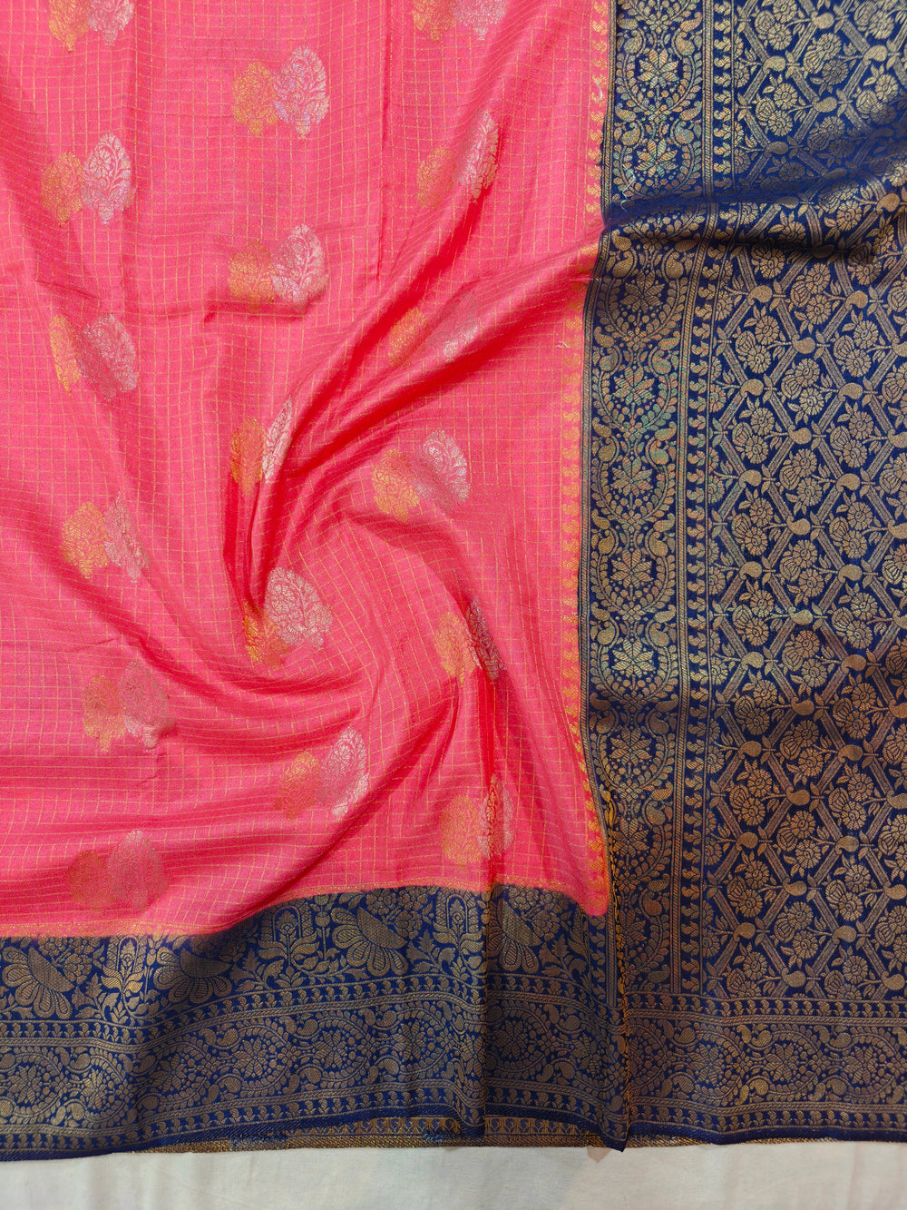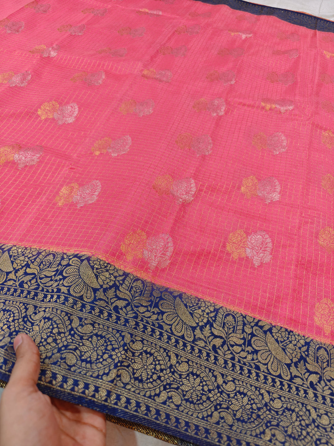 PEACH COLOUR CREPE GEORGETTE CHECKS WITH ROYAL BLUE BORDER
