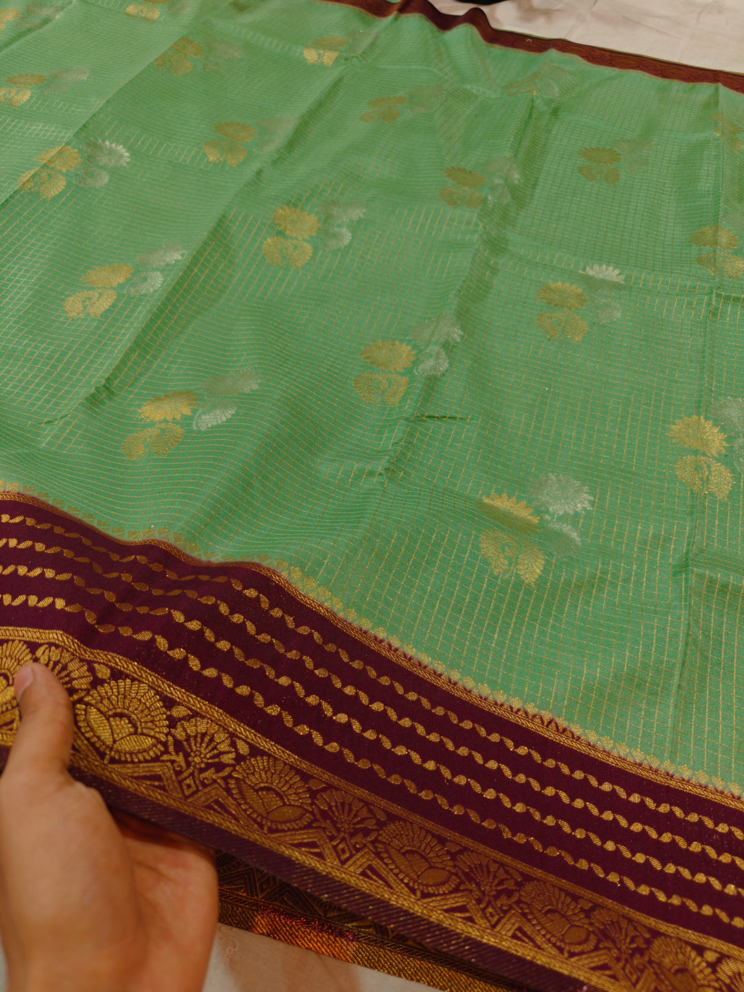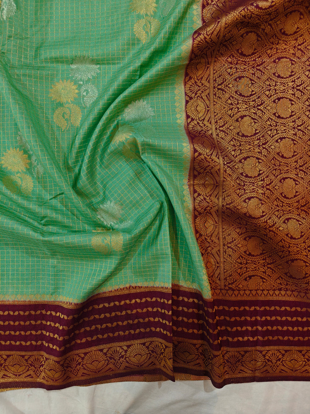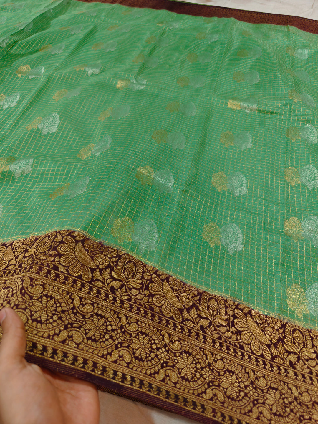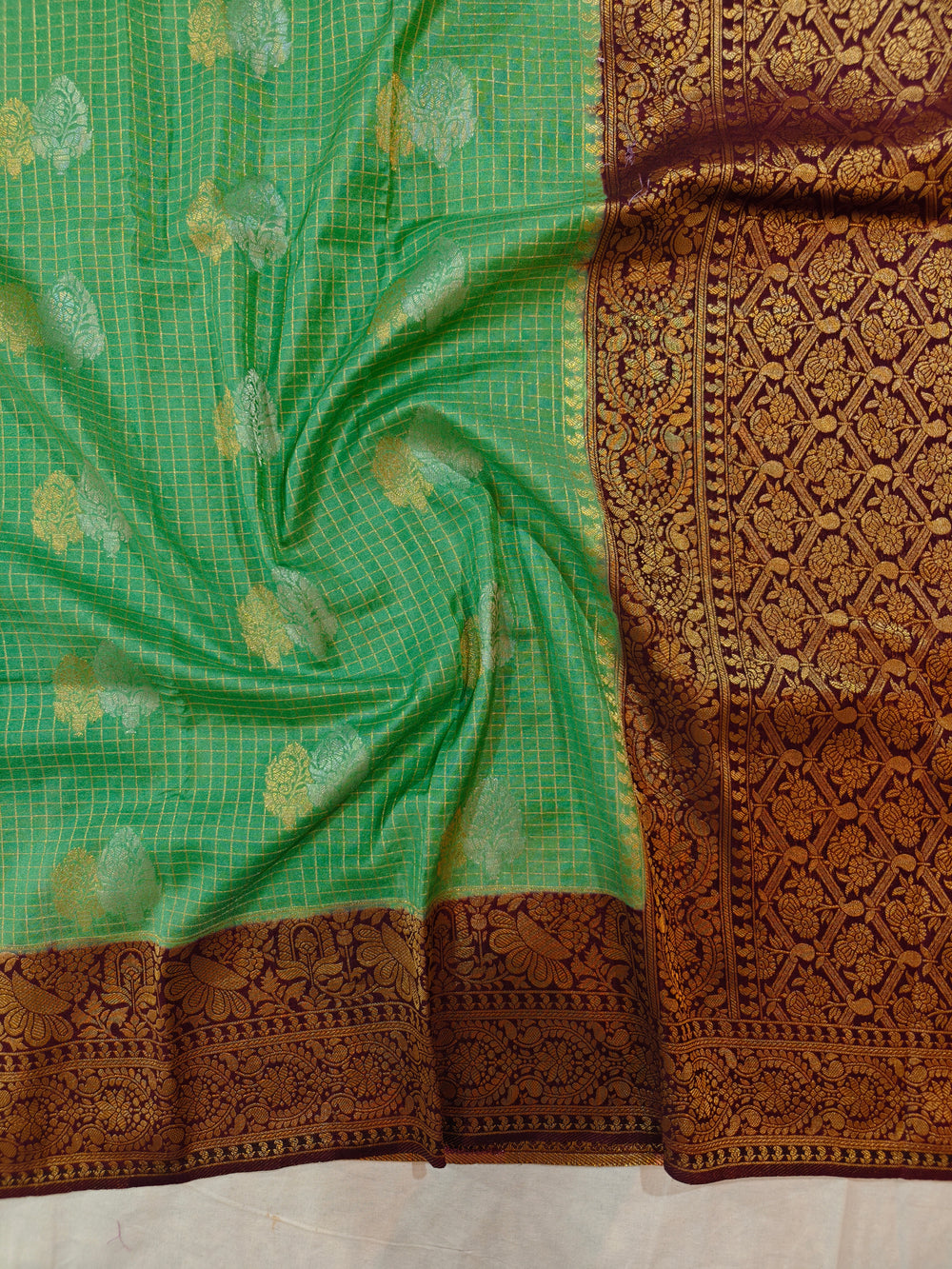 PISTA GREEN CREPE GEORGETTE CHECKS WITH GARNET BORDER