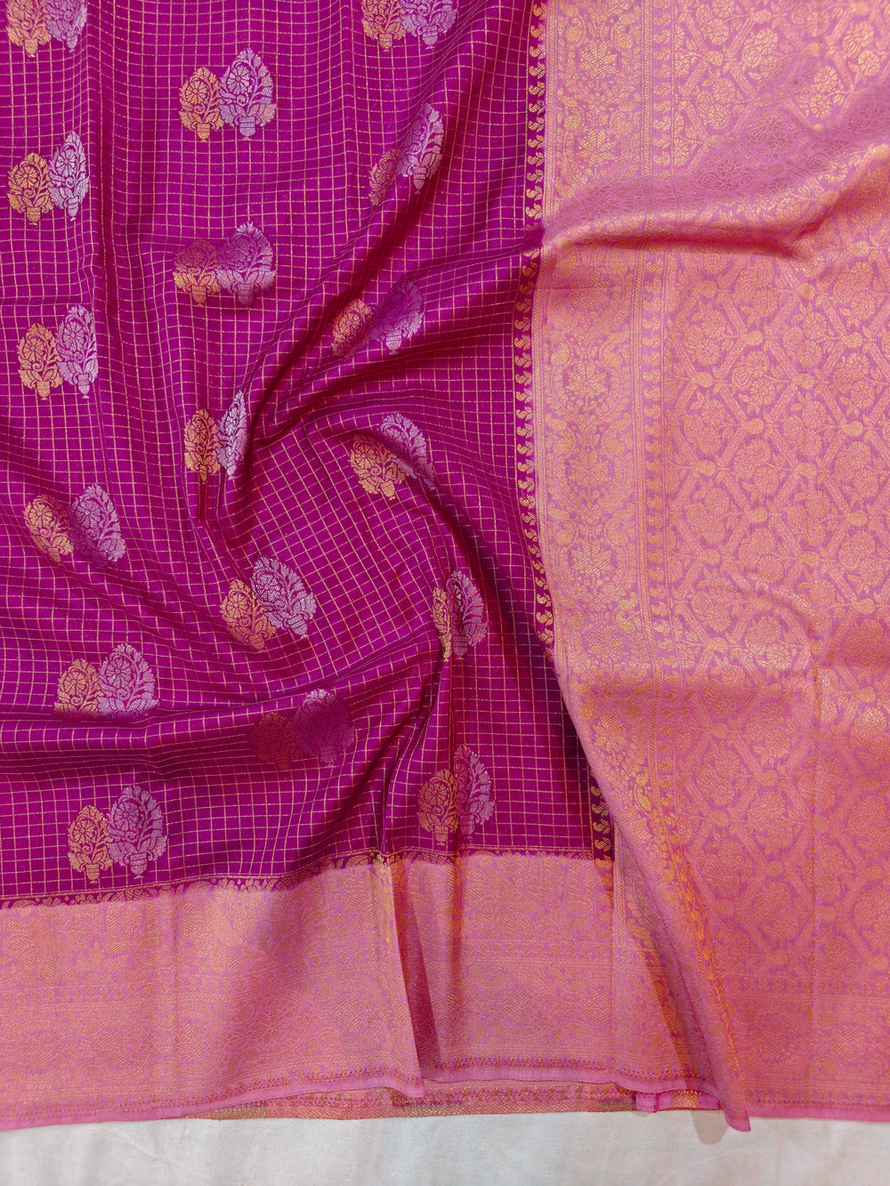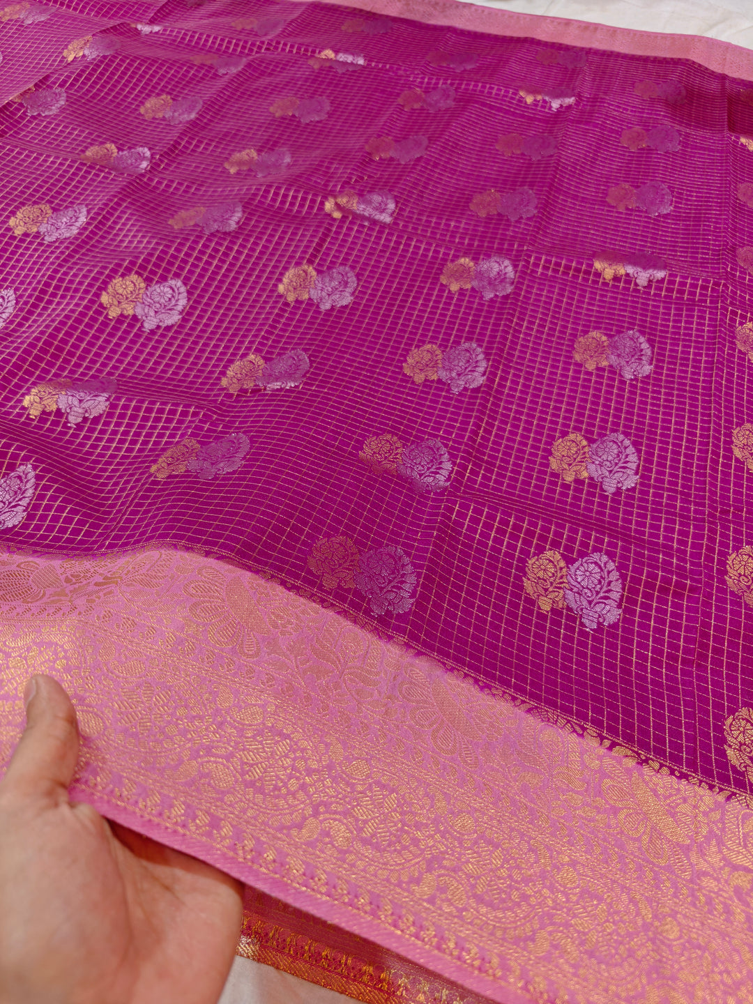 MAGENTA COLOUR CREPE GEROGETTE CHECKS WITH BABY PINK BORDER