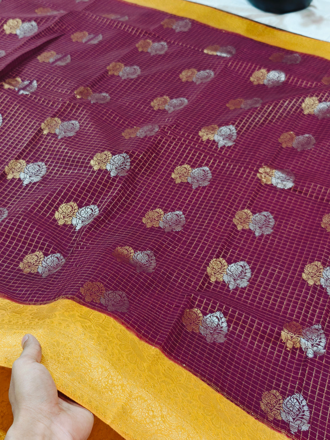 CHOCOLATE COLOUR CREPE GEORGETTE CHECKS WITH GOLD BORDER