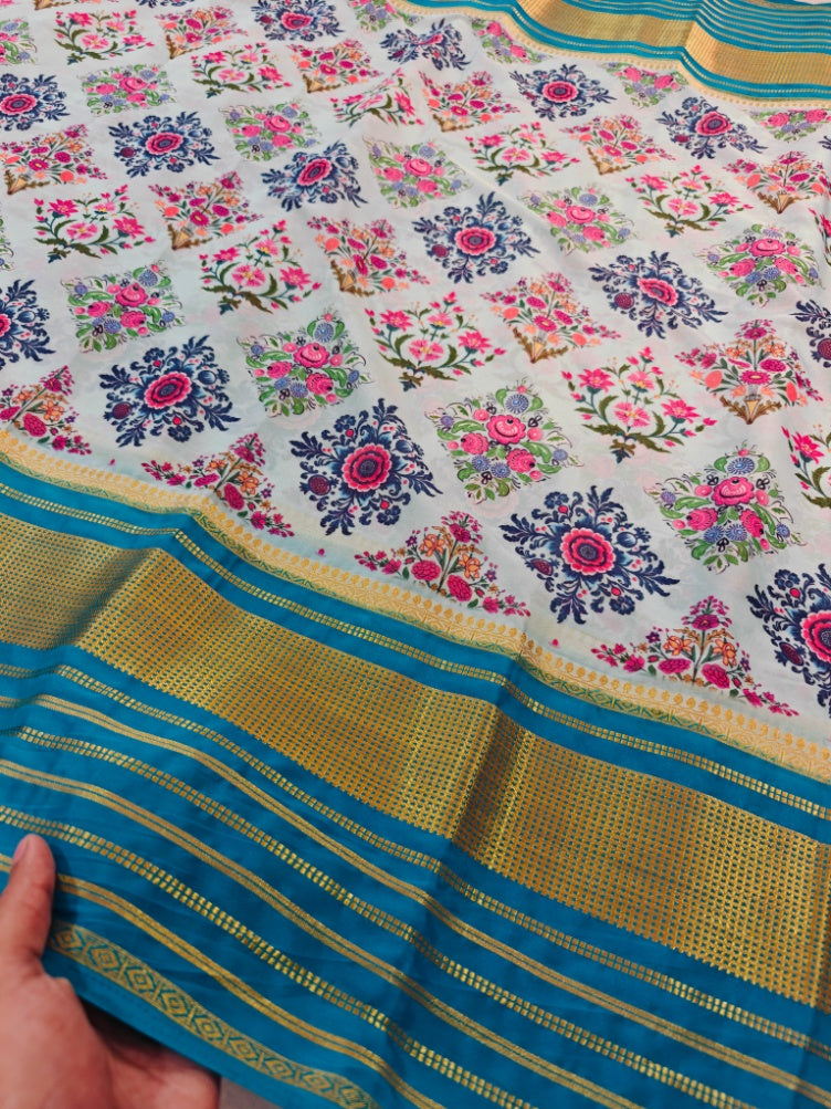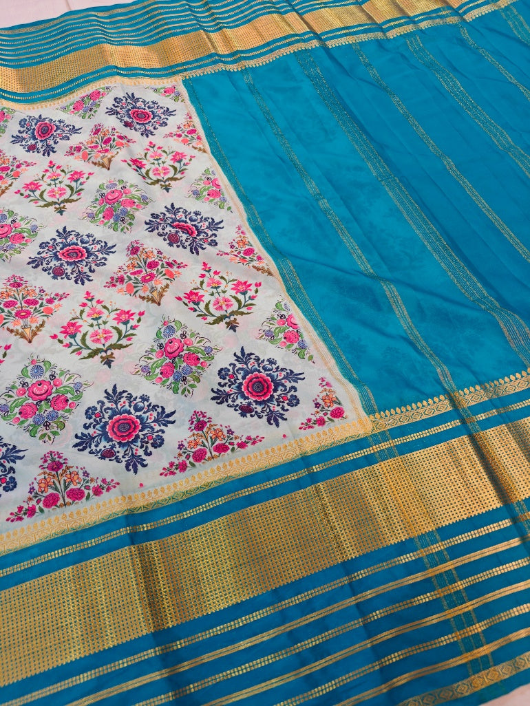 A graceful border runs along one edge: a flowing wave-like band in turquoise-blue, accented by golden-yellow stripes and a fine golden geometric motif. Below it sits a wider, richly textured border in deep turquoise-blue with narrow golden horizontal stripes and a subtle woven/checkered texture, finished with thin golden lines and small geometric patterns. The overall look is fresh, feminine, festive, and perfect for summery ethnic wear or fusion styling.