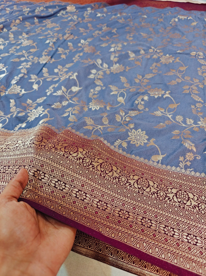 STEEL GREY KHADDI GEORGETTE WITH GARNET BOREDR
