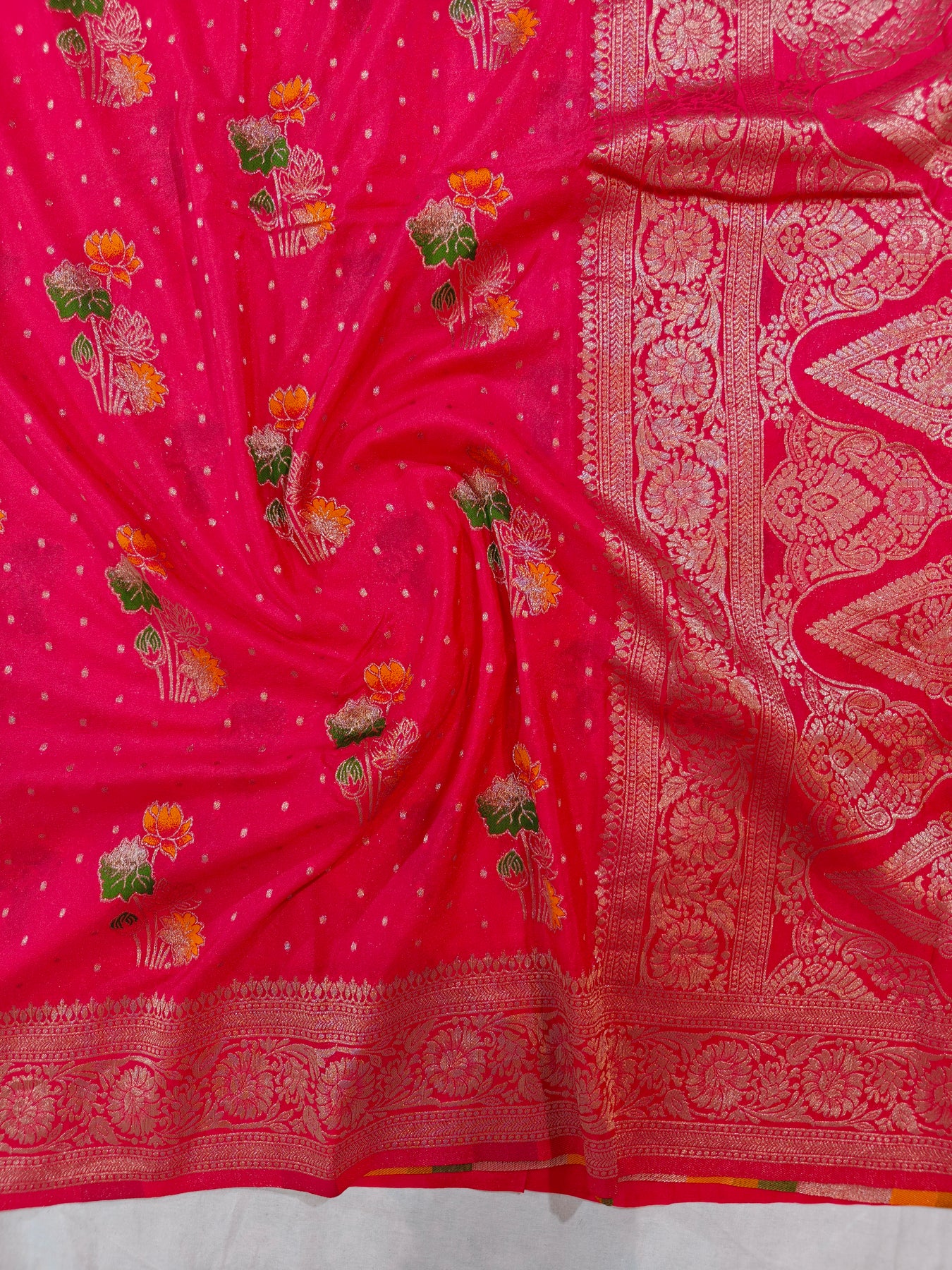 Bold and captivating, this cherry red khaddi georgette saree embodies festive grandeur with timeless appeal. The lightweight, textured fabric drapes effortlessly, creating a graceful and fluid silhouette. Scattered panchrang boota motifs add a lively burst of color, enhancing the richness of the vibrant red base. Fine zari dots lend a subtle shimmer, elevating its elegance. The highlight lies in its opulent woven pallu and border, intricately adorned with traditional paisley and floral patterns that reflect masterful craftsmanship. Perfect for weddings and celebratory occasions, this saree blends striking color with classic detailing, making it a statement piece in any ethnic wardrobe.