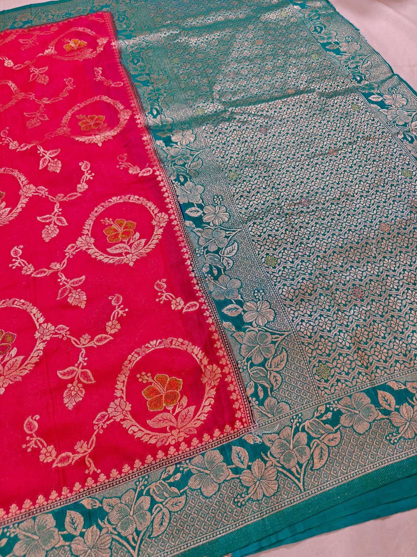 This vibrant Khaddi Georgette saree in rich magenta red radiates festive elegance and timeless charm. The lightweight, flowing fabric features an intricate all-over zari jaal with circular floral medallions connected by delicate vine motifs in shimmering gold and multicolour accents. The wide, luxurious teal-green border is heavily embroidered with bold silver zari floral patterns and geometric designs, creating a striking and sophisticated contrast. Soft, breathable, and with graceful drape, this premium Khaddi Georgette offers superior comfort paired with heavy traditional opulence. Perfect for weddings, receptions, and grand occasions, it masterfully blends classic Banarasi-style grandeur with the airy sophistication of Khaddi silk.