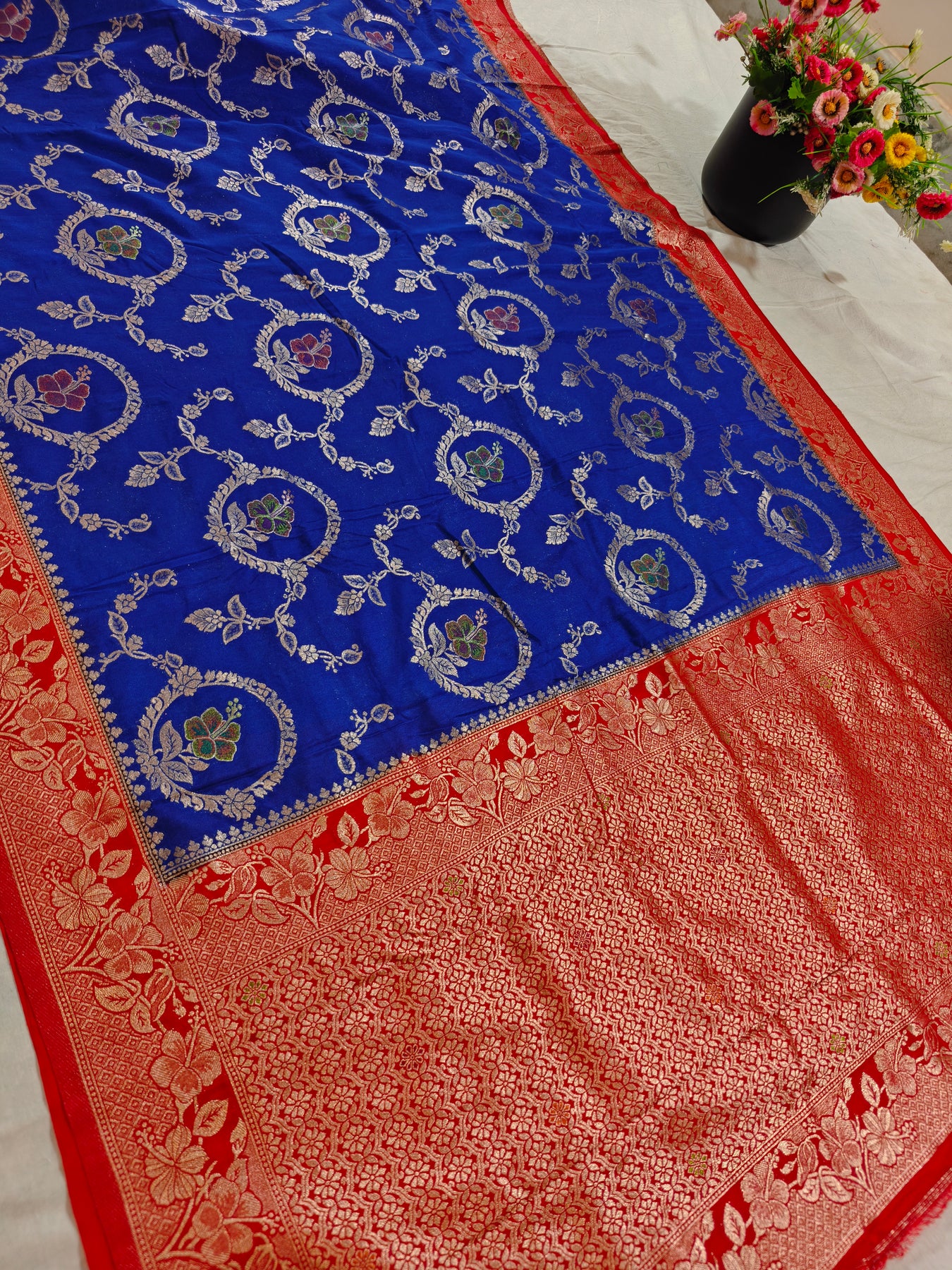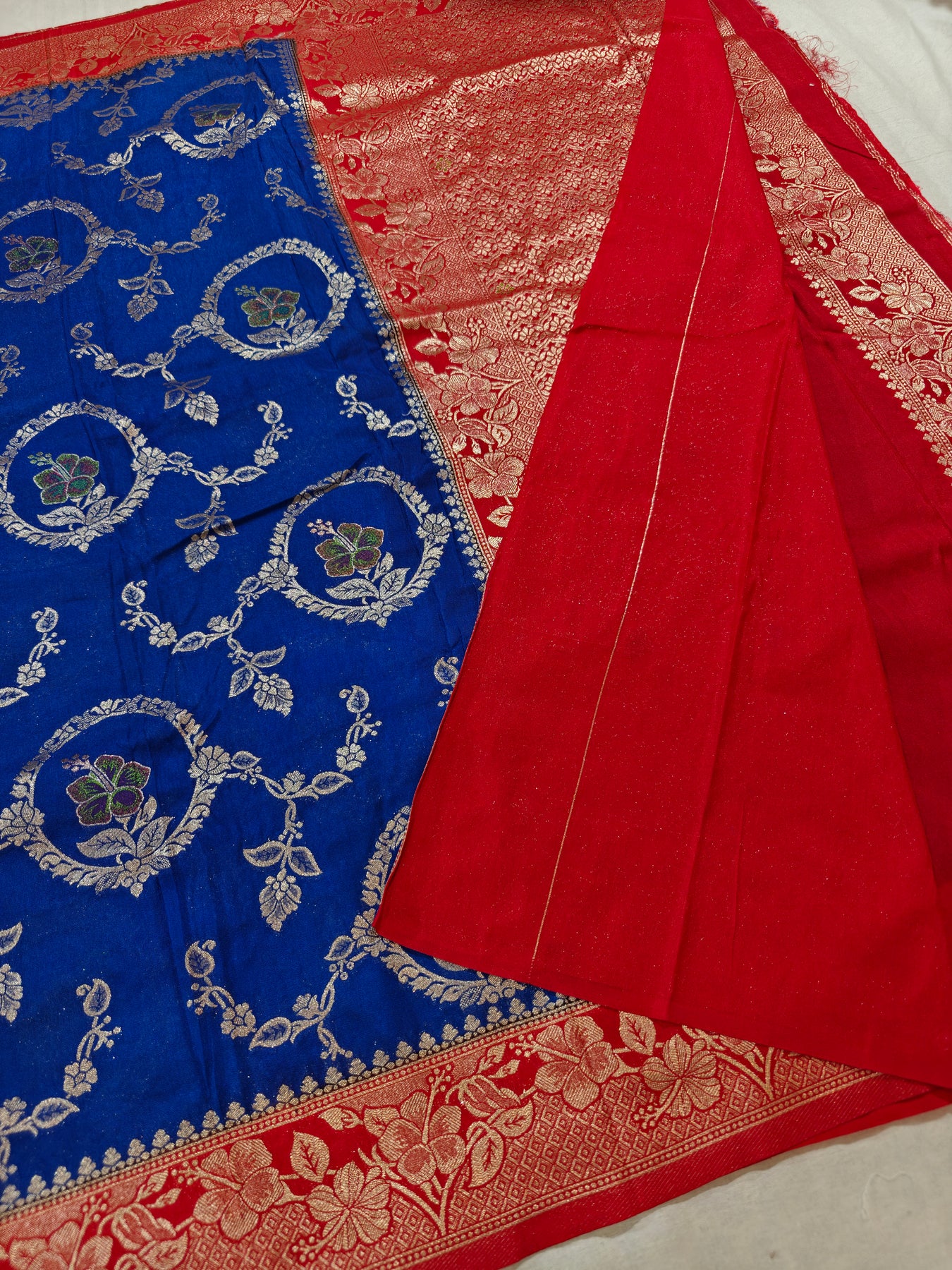 This regal Khaddi Georgette saree in vibrant royal blue showcases exquisite craftsmanship. The lightweight, flowing fabric features a dense all-over zari jaal with circular floral medallions connected by delicate vine motifs in shimmering silver and multicolour accents. The wide, luxurious red border is heavily embroidered with intricate gold zari floral patterns and geometric designs, creating a striking and opulent contrast. Soft, breathable, and with graceful drape, this premium Khaddi Georgette offers superior comfort with heavy traditional grandeur. Perfect for weddings, receptions, and festive celebrations, it beautifully blends classic Banarasi-style richness with the airy elegance and comfort of Khaddi silk. A timeless ethnic masterpiece.