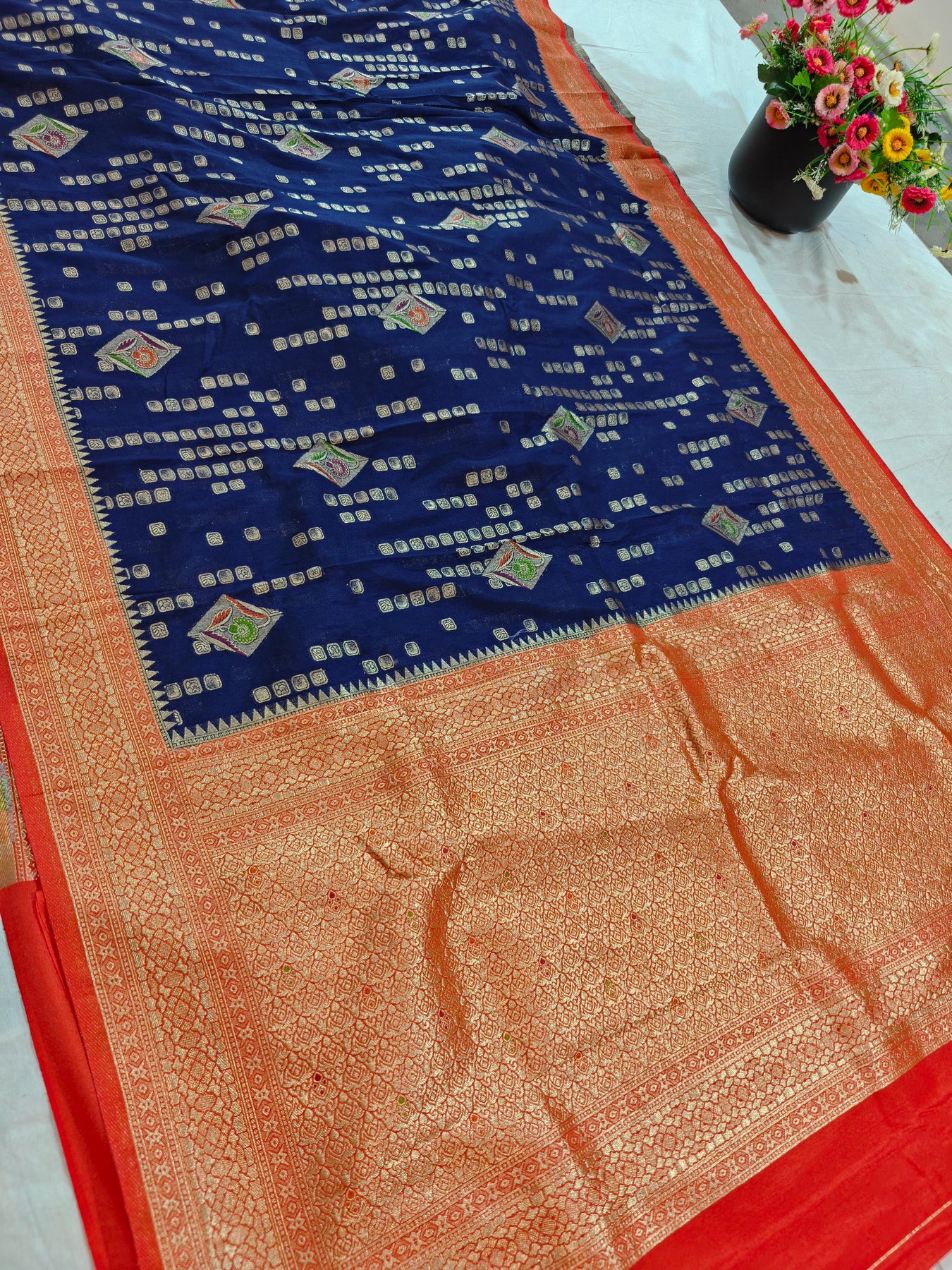 Perfect for festive occasions, evening functions, and weddings, this navy blue Khaddi Georgette with red border combines classic tradition with contemporary flair for a stunning ethnic ensemble.