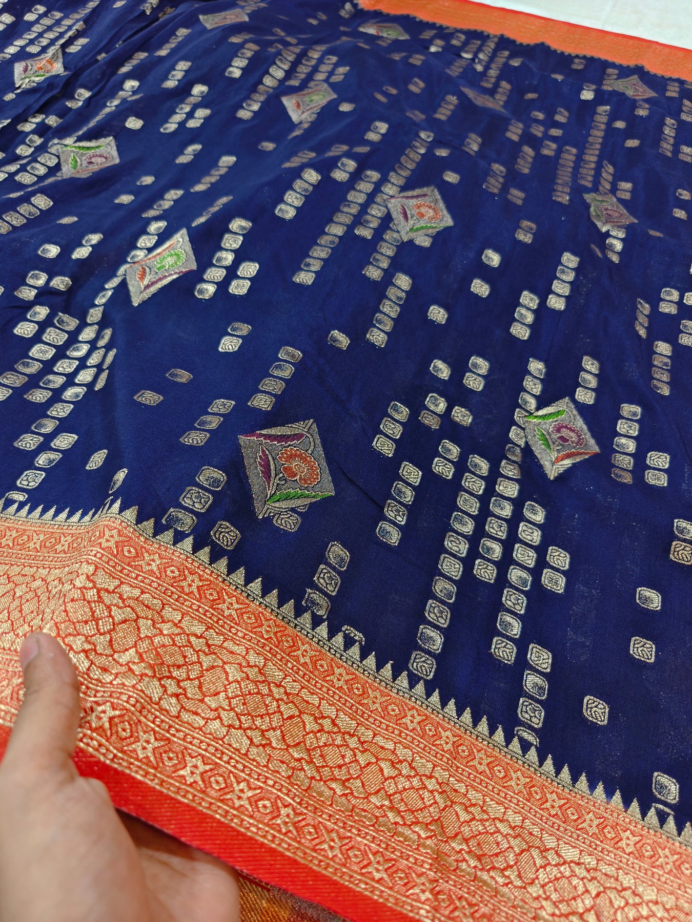 The body features delicate gold square motifs in neat rows, beautifully complemented by scattered diamond-shaped floral butis in vibrant multi-colors that add artistic charm.