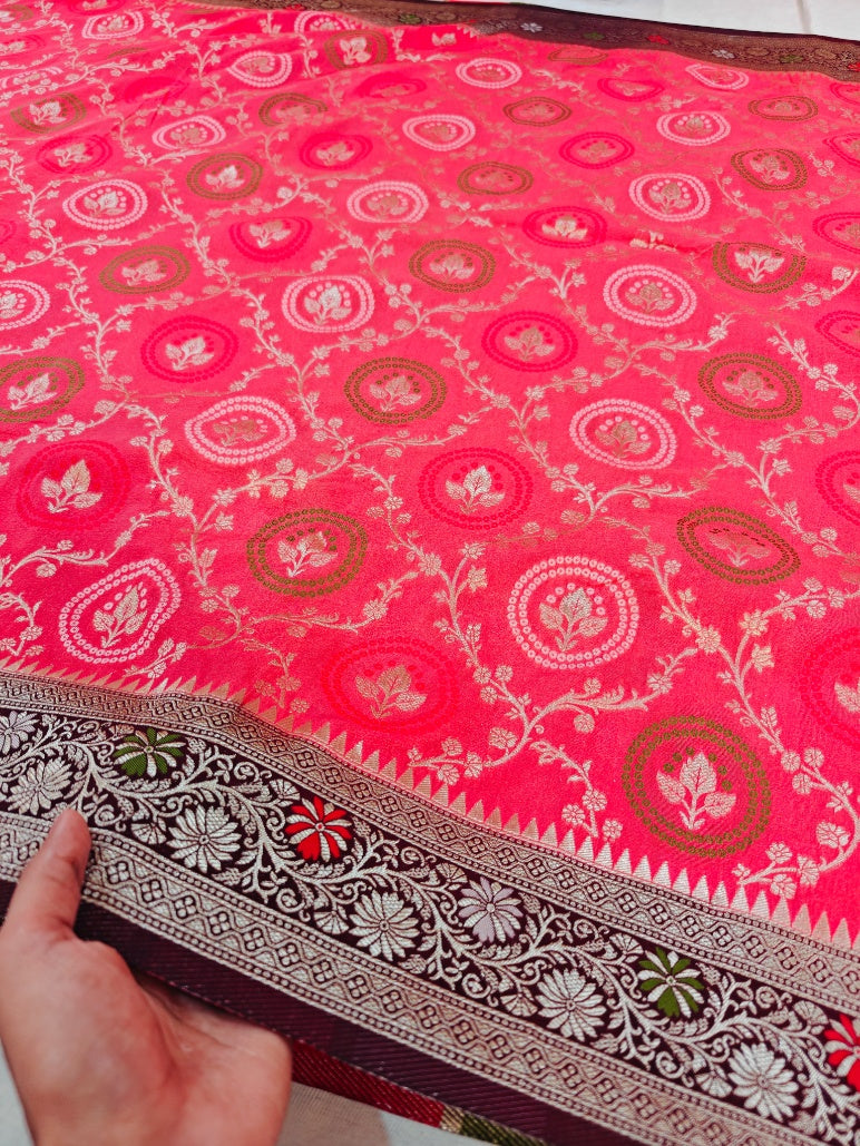 This vibrant khaddi georgette fabric showcases a stunning coral-red base adorned with intricate golden butis and paisley motifs in delicate floral jaal patterns, evoking timeless Banarasi elegance. Handwoven on traditional looms in Varanasi, khaddi georgette blends the airy, crinkled texture of georgette—created from tightly twisted silk yarns—with the authentic "khaddi" handloom heritage, resulting in a lightweight, breezy drape that's sheer yet luxurious.
