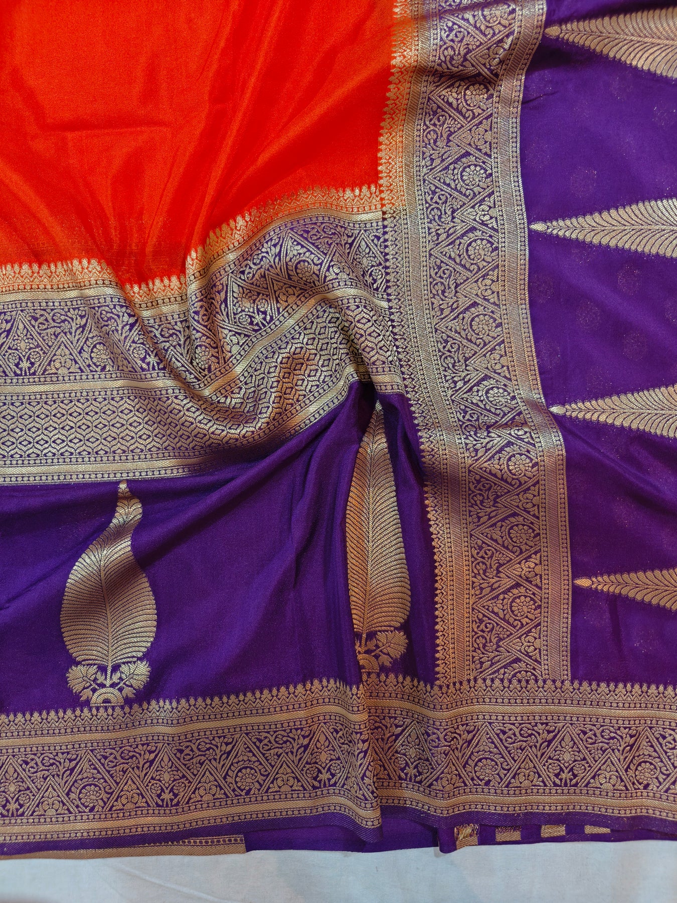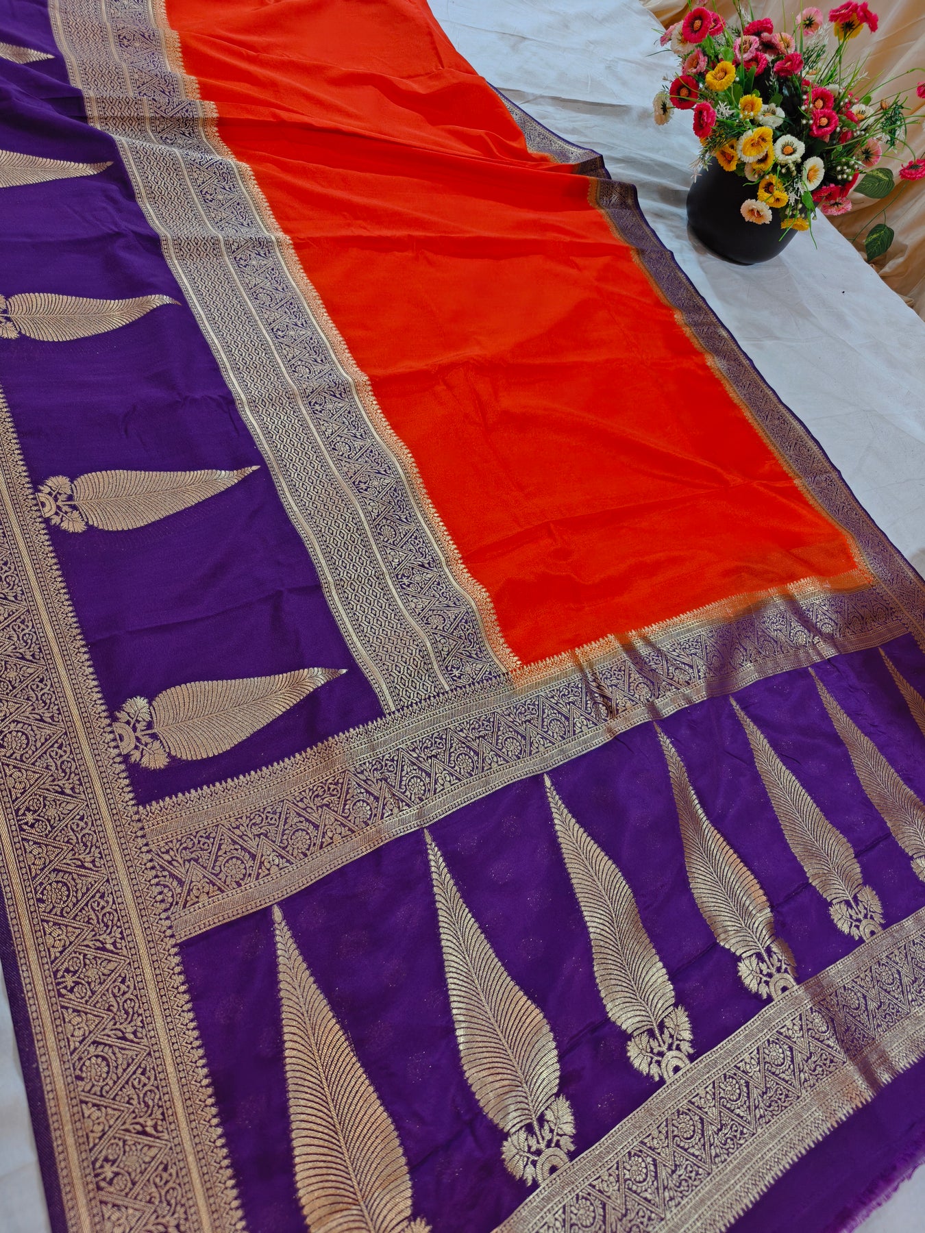 Khaddi georgette is prized for its lightweight, breathable texture with a subtle natural sheen and excellent drape. The contrast between the fiery orange, deep blue, and shimmering zari makes this piece ideal for festive occasions and weddings, blending traditional Banarasi-style craftsmanship with the soft, flowing elegance of georgette.