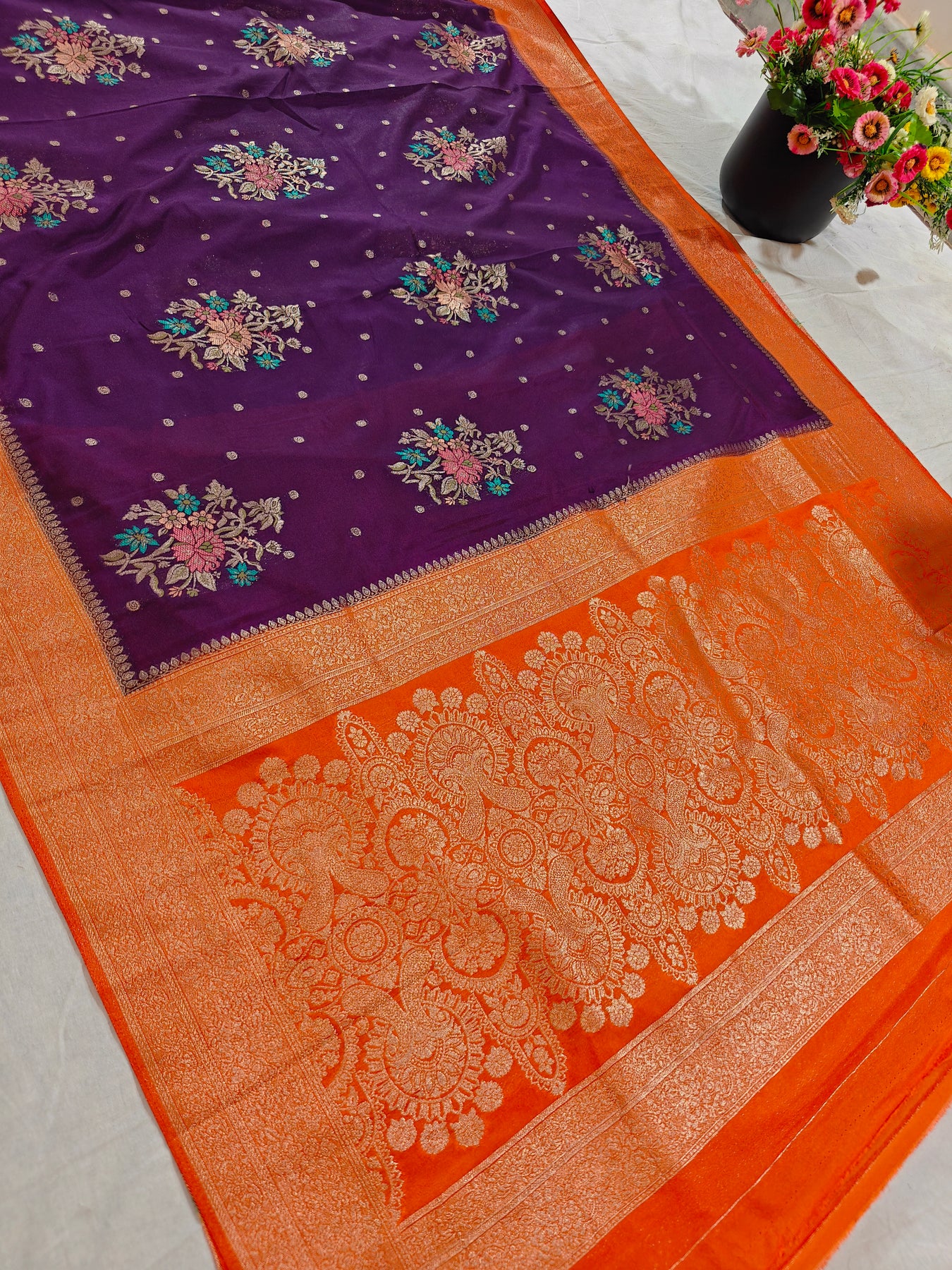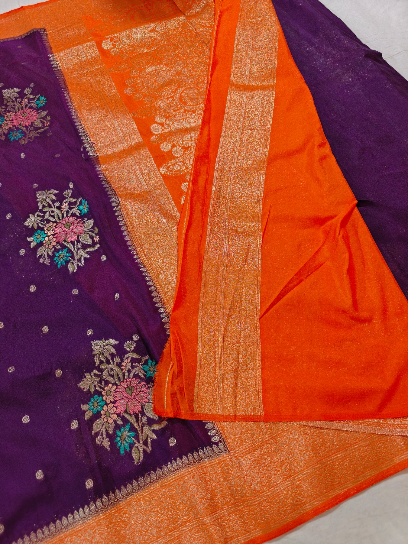 A rich expression of heritage, this khaddi georgette saree features elegant panchrang boota motifs that bloom gracefully across a deep, regal base. The lightweight texture drapes fluidly, offering both comfort and refined movement. Each multicolored floral buta is intricately woven, adding subtle vibrance without overwhelming the composition. Delicate zari dots scattered throughout enhance its understated shimmer. The contrasting border, detailed with fine craftsmanship, anchors the design with a bold finish. Ideal for festive gatherings and intimate celebrations, this saree balances tradition and sophistication, making it a versatile addition to any wardrobe that appreciates timeless artistry.