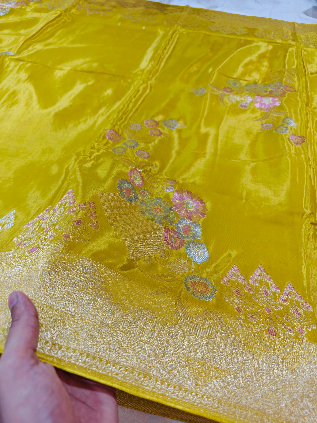This vibrant Korean Silk saree in bright golden yellow radiates joy, warmth, and festive elegance. The smooth, lustrous fabric drapes beautifully with a rich natural sheen. Delicate multi-coloured floral motifs with gold zari accents adorn the body, while the wide, opulent gold border features heavy, intricate zari embroidery with dense floral patterns, paisleys, and traditional motifs in shimmering gold and pastel tones. Soft, shiny, and with excellent drape, premium Korean silk offers a luxurious feel and graceful fall. Perfect for weddings, pujas, and special occasions, this saree beautifully blends modern sophistication with classic ethnic opulence, making it a standout piece for any grand celebration.