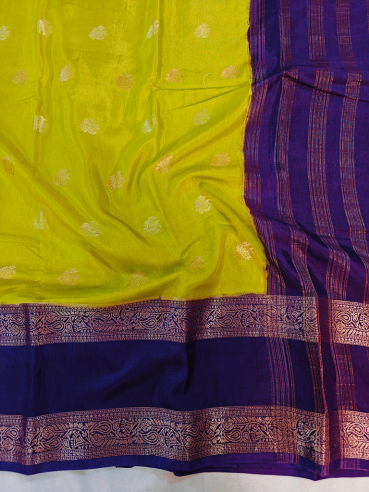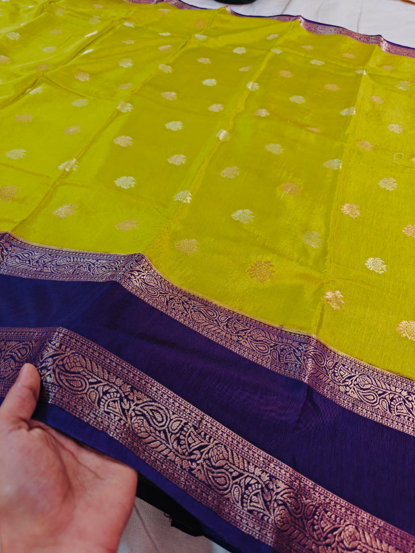 PARROT GREEN RUSSIAN SILK WITH INDIGO BORDER