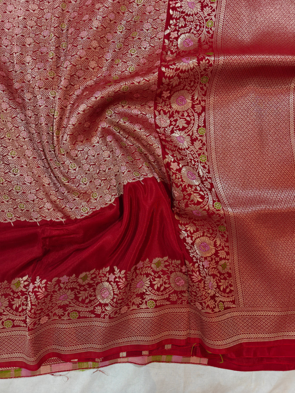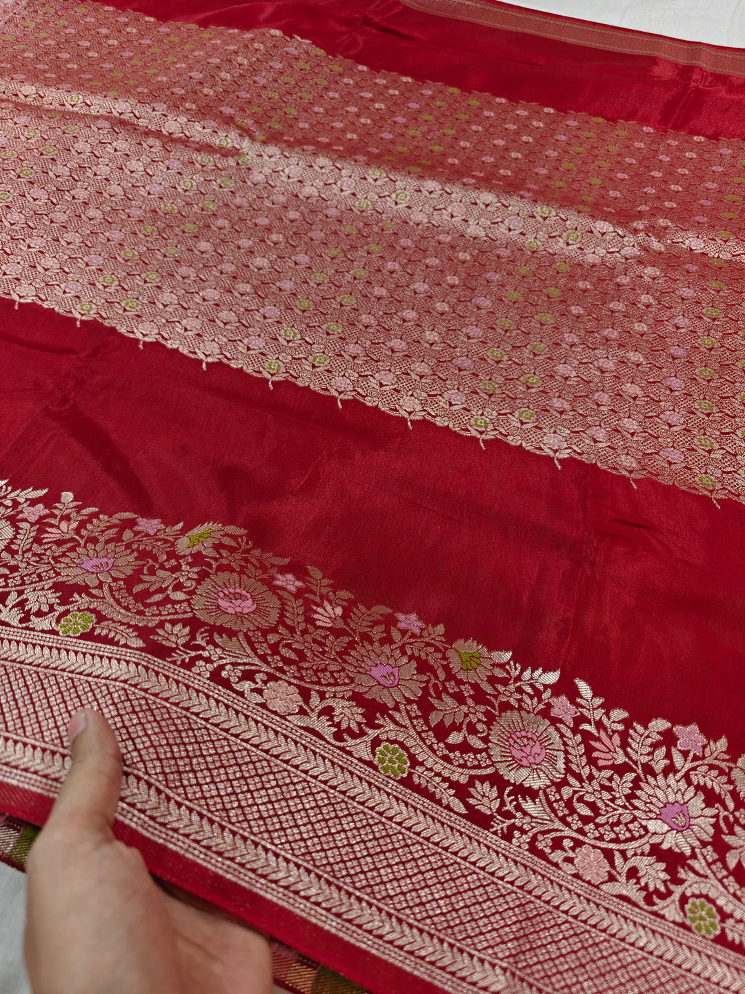RUSSIAN SATIN SILK IN BRIGHT RED COLOUR WITH TILFI BOOTA BORDER