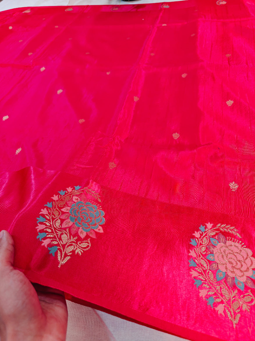 This striking saree boasts a vibrant fiery rani base, exuding warmth and festivity. The lightweight, sheer fabric (possibly georgette, chiffon, or fine silk-like material) offers elegant drape and subtle sheen. Scattered across the field are delicate golden floral motifs and small butis, accented with hints of turquoise/blue in the larger blooms, creating a balanced, eye-catching pattern. The highlight is the bold, large embroidered floral medallions featuring intricate gold zari work with GOLDEN, blue, and beige petals, positioned prominently along the edges or pallu. This handcrafted piece radiates traditional elegance and celebratory charm, ideal for weddings, festivals, or special occasions.