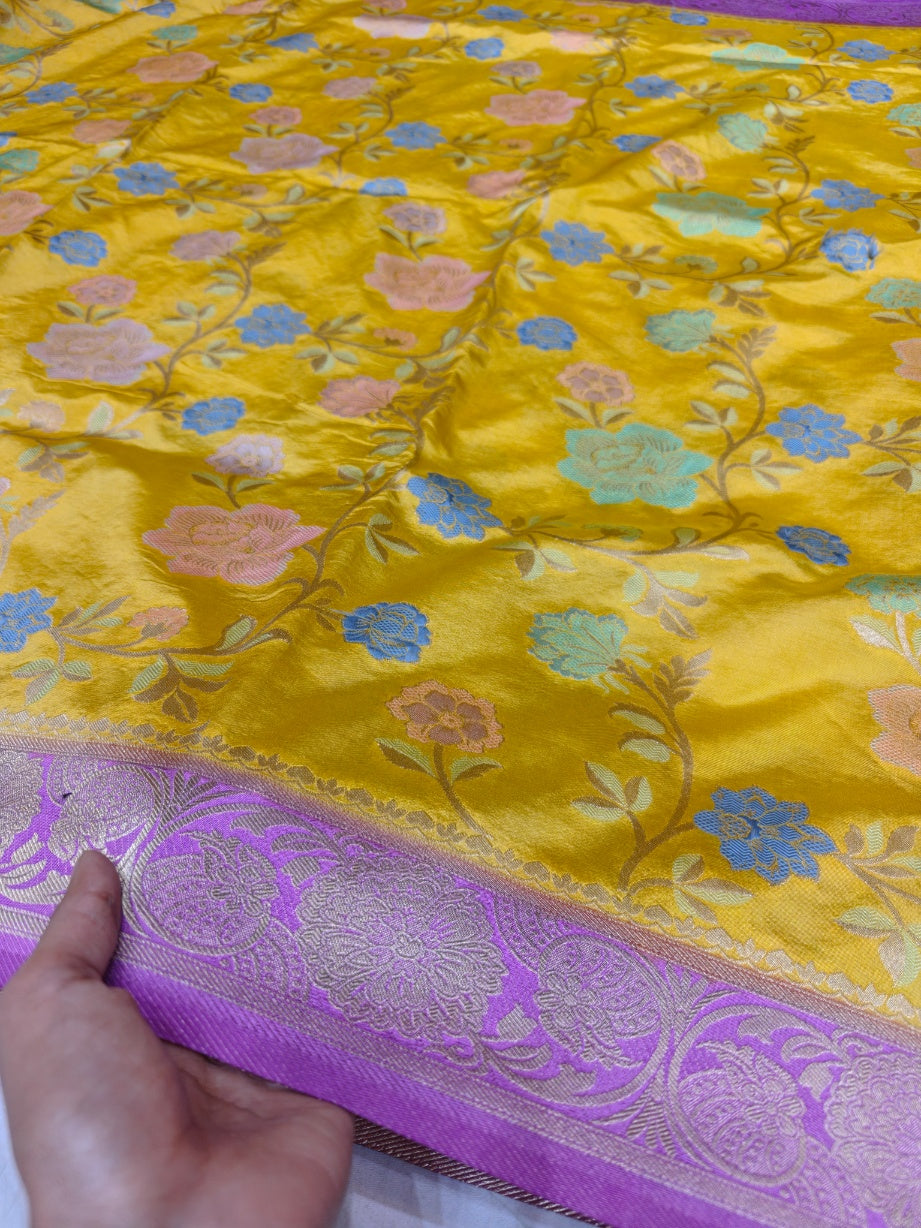 This premium Tilfi Banarasi saree features an all-over jaal (fine floral lattice or intricate interconnected motif network) design woven in lightweight viscose (viscose silk blend—smooth, glossy, breathable, and fluid drape, often called "viscose Russian silk" or semi-silk in Varanasi for affordability and elegance). The main body is in airy gold (a light, ethereal golden hue—soft champagne gold or muted metallic gold with a subtle sheen, giving an airy, luminous, and sophisticated look without being heavy).