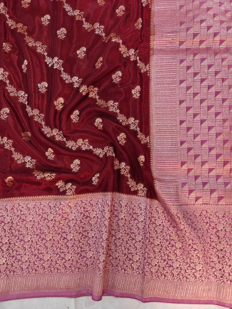 RUSSIAN SILK IN MAROON AND BABY PINK COLOUR BORDER WITH DIOGNAL FLORAL DESIGNS