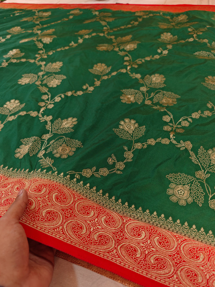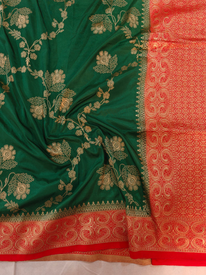 RUSSIAN SILK WITH ZARI MOTIF IN BOTTLE GREEN COLOUR