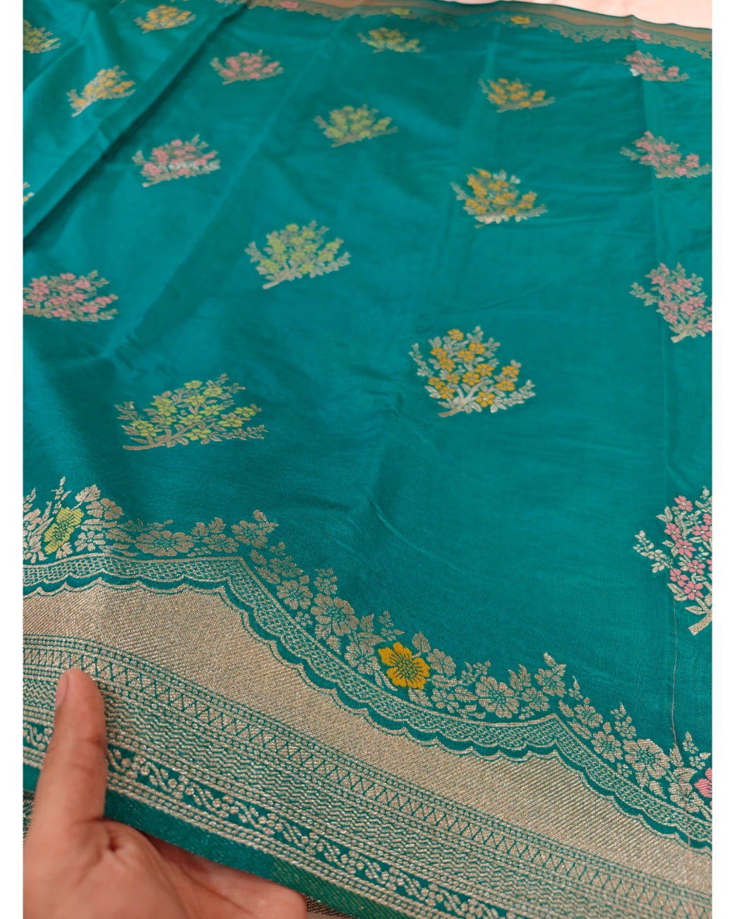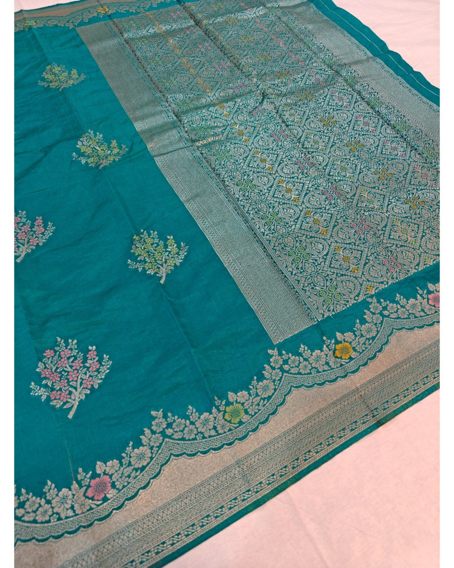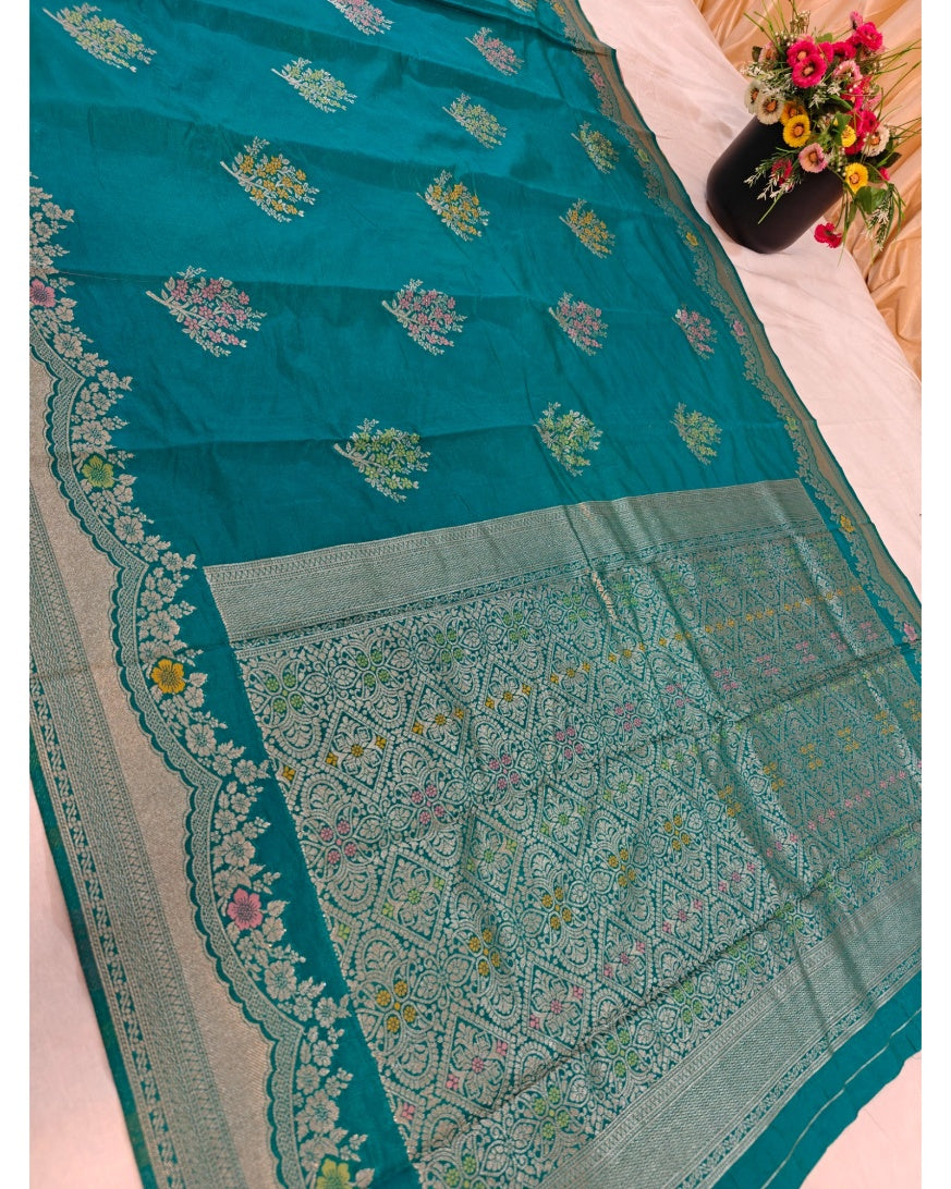 Sea green Raw Mango silk Banarasi with Minakari alfi boota all over the body—is a stunning, popular style right now. The sea green (soft turquoise/aqua shade) field is scattered with delicate alfi minakari boota/buti (small floral motifs woven in fine gold/silver zari with colorful enamel-like meenakari accents). These tiny bootas cover the entire body subtly, creating a shimmering, festive sparkle without being overpowering. The borders and pallu often feature contrasting zari work, kadwa weaving, or richer meenakari for balance.