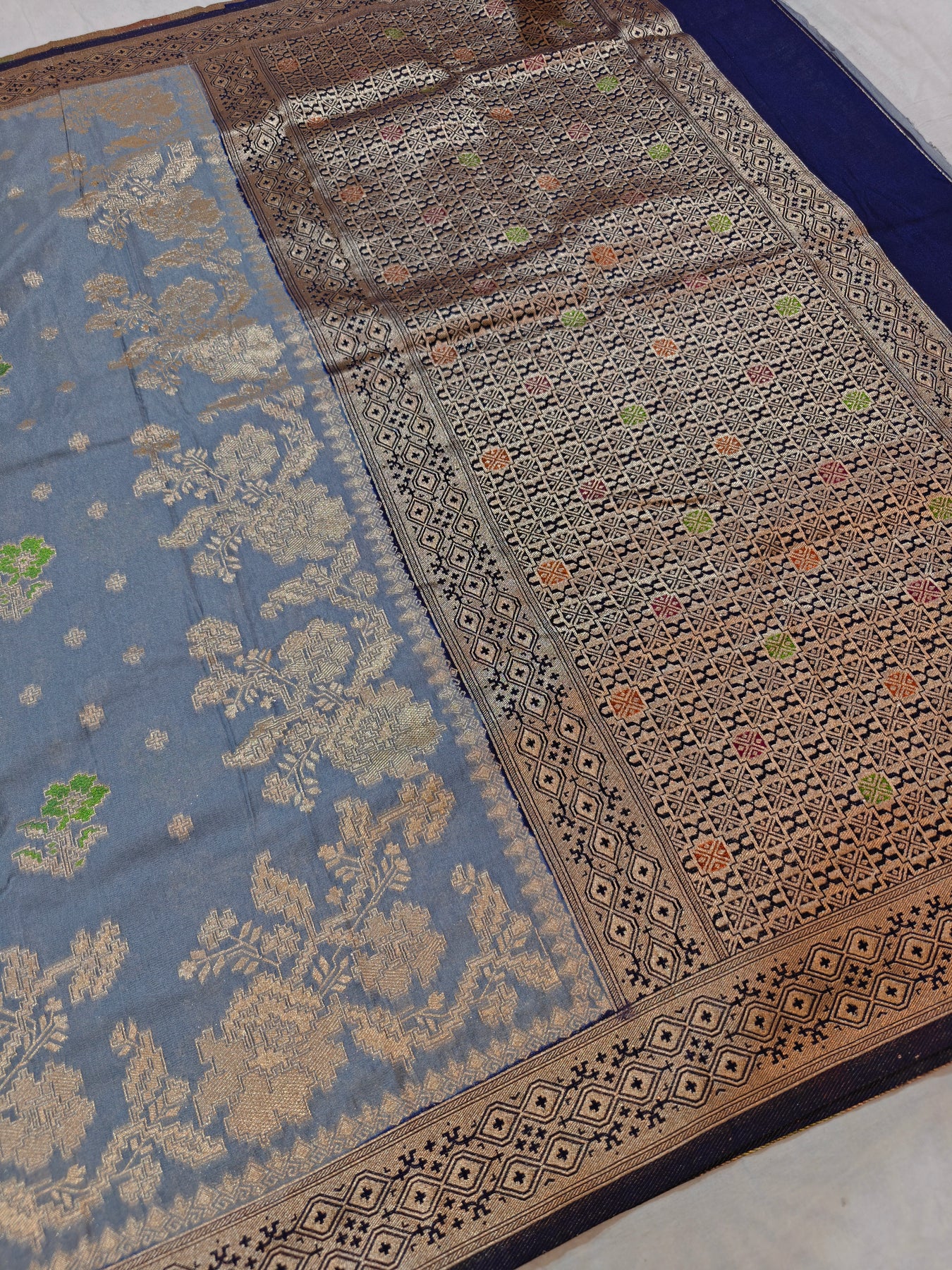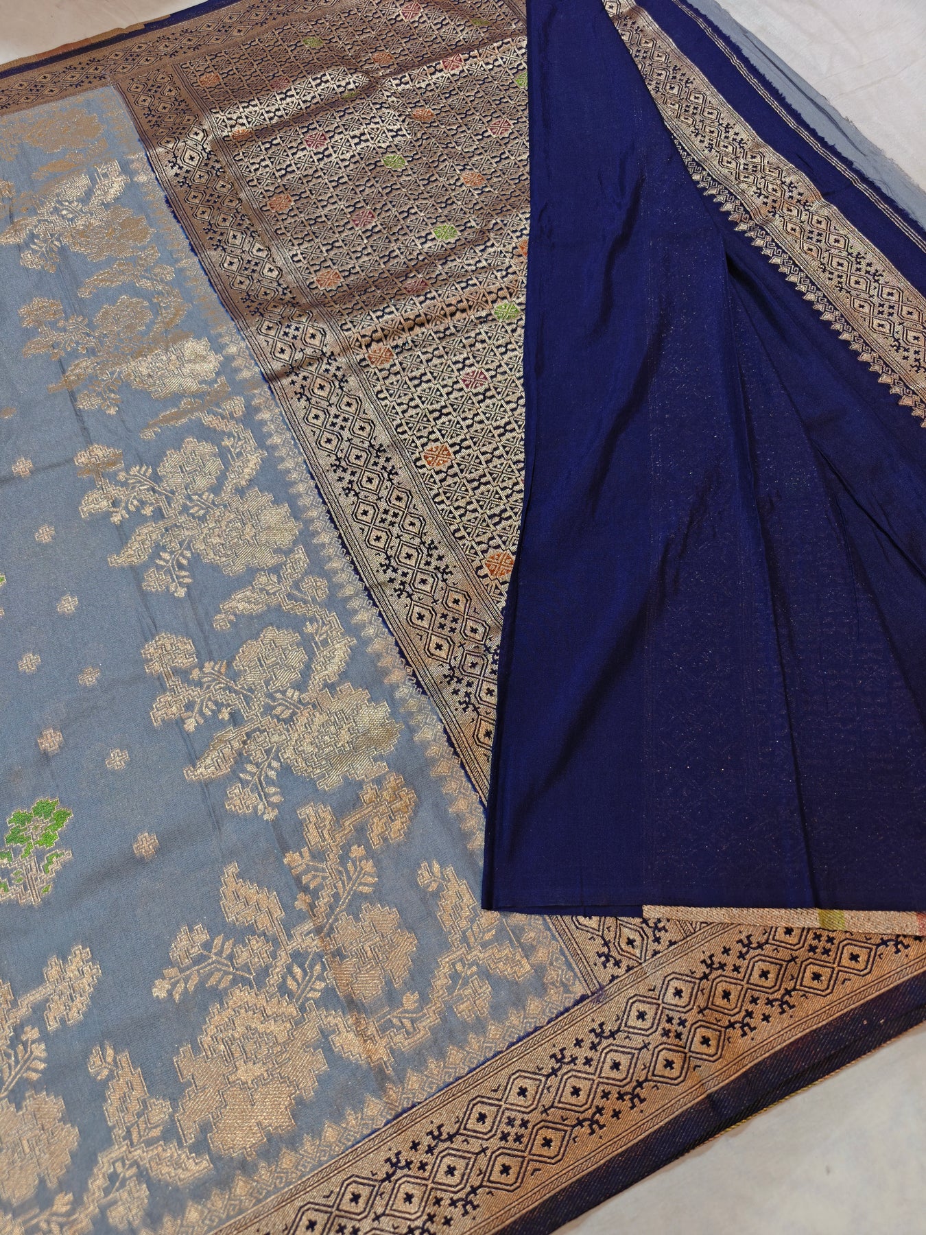 This elegant Khaddi Georgette saree in soft sky blue showcases exquisite craftsmanship. The lightweight, flowing fabric features delicate scattered zari motifs across the body and a rich, heavily embroidered border in shimmering gold zari with intricate geometric and floral patterns on a deep navy base. The pallu displays dense, luxurious zari work with traditional motifs, adding opulent sparkle. Crafted from premium Khaddi Georgette, it offers superior drape, breathability, and all-day comfort. Ideal for weddings, festivals, and formal occasions, this saree perfectly blends classic Banarasi-style grandeur with the soft, graceful elegance of Khaddi Georgette silk. A timeless piece that radiates sophistication and charm.